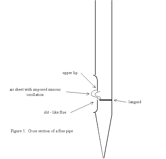 (neglecting end corrections at the mouth and the top). It is emphasised that the statement just made, that open pipes are half a wavelength long, is only an approximation to reality. In fact, as any organ builder knows, the variation in length between pipes having the same musical pitch is considerable. This is because their scale, or cross-sectional area as a proportion of their length, is also important in determining pitch. Audsley, although neither an organ builder nor a scientist (he was an architect), could scarcely contain his venom when pointing this out in his usual verbose and opaque fashion 4. He quoted an example where two stopped pipes, one more than twice as long as the other, nevertheless gave the same note - one was short and fat and the other long and thin. The reason is the end correction which has to be applied, and this is greater for fat pipes than thin ones. An end correction occurs at the mouth as well as at the top (if open), which explains Audsley's result for stopped pipes. End corrections are also largely responsible for determining the timbre or tone quality of the pipe, as will be explained later. The misunderstanding also arises because of the tendency to regard an organ pipe merely as a gaseous version of a violin string, but this is seriously mistaken. A pipe is not a one-dimensional structure like a string but a three-dimensional resonating cavity, all of whose dimensions have to be considered if a satisfactory theory of its operation is to be developed.