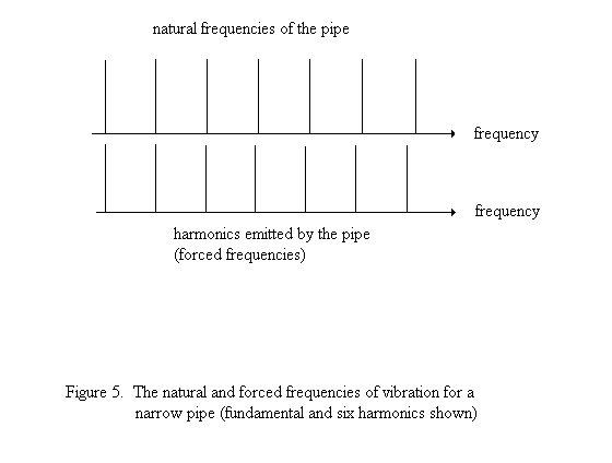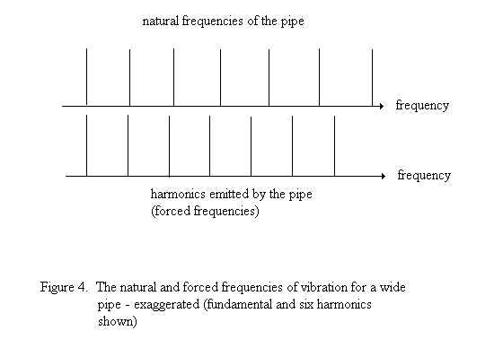 When there is a transient, the frequencies emitted by the pipe are influenced by its natural frequencies, and these usually are not exactly harmonically related as explained earlier in the section dealing with pipe width. However once the pipe has settled down to stable speech in the steady state phase, the frequencies it emits are the forced vibration frequencies of the pipe, and these are exact harmonics of the fundamental. During the transient phase, the non-harmonic emissions are pulled progressively into phase-lock with each other as the forced vibration frequencies take control. A detailed analysis of the curious and beautiful transient emitted by a Violone pipe, and the actual sound it makes, can be found in another article on this site 5 .