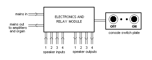 The system is connected as in the general arrangement shown at Figure 4, where the box labelled “electronics and relay module” corresponds to the picture shown above (Figure 3). This unit is interposed in series with the mains inlet lead instead of connecting it directly to the organ, thus it switches the mains supply to the organ and therefore to the amplifiers as well. The loudspeaker feeds from the power amplifiers (four in the diagram) are first taken to the unit, which therefore switches the audio signals to the loudspeakers after the proper time delays. A further cable connection is taken from the unit to the console plate containing the push buttons and LEDs.