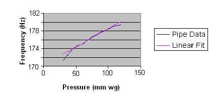 As with the winding system, acoustic coupling is a dynamic process in which the effects vary continuously and rapidly as a pipe organ is played. Modelling it is not as straightforward as in the case of the air supply and various heuristic assumptions have to be made. An organ pipe sometimes emits an audible transient sound (chiff, spit, etc) when it is keyed. However not all do, and that is partly because some organ builders both in the past and today regard them as undesirable. So do many players and listeners. Organ builders can choose either to emphasise or suppress transients if they are good enough at voicing. Transient formation in flue pipes is discussed in detail in [3] which deals with flue pipes, although some of the factors also apply to reeds as well. That article enumerated the main issues which will now be discussed in relation to sound synthesis in digital organs. Aside from the pipe itself, the main factors influencing the attack transient are static wind pressure, fluctuations in wind pressure about the static value, the type of chest, the type of valve and valve opening time. There are also subsidiary factors such as whether conveyances beyond the valve are used to take wind to the pipes. Of these, the only ones which can result in variations in speech from one time to the next (which are the only ones of interest here as explained above) are valve opening time, which translates into keying velocity in a mechanical action, and wind pressure fluctuations. These will now be discussed. The speed at which a note is keyed can influence the attack transient to some extent in organs with a sufficiently responsive mechanical action, though obviously not with pneumatic or electric actions in which the speed at which the pipe valve opens is fixed. The matter was discussed in my paper which appeared in Organists’ Review some years ago, also now available elsewhere on this website [8]. However, even in those cases when the player can modulate transient effects from the keyboard it is doubtful whether many actually do [9]. Nevertheless, by varying those parameters in a physical model which depend on key velocity (which can easily be obtained using standard MIDI techniques) the transient will in turn vary according to keying speed. However this is also possible with sampled sounds. By storing a reasonable number of different attack transients (which only occupy a small amount of memory because they are of such short duration), the appropriate transient for a given key velocity can be automatically selected. It is then a simple matter using standard wave editing techniques to cross-fade the end of the selected transient into the stored steady state waveform. With additive synthesis the matter is not quite so straightforward because it is often difficult to analyse the frequency structure of a transient in enough detail to enable an additive synthesis organ to give a convincing rendering of it. Consequently these difficulties would be magnified if it were necessary to analyse and store a frequency representation, not just of one transient, but of several to correspond with different key velocities. Wind pressure controls the likelihood that a flue pipe will momentarily overblow when it is keyed and thus whether it will emit an attack transient such as chiff, which is when a pipe briefly emits one or more higher harmonics before settling down to stable speech. This is discussed in detail in [3] and only a summary is included here. Figure 3. Measured variation of fundamental frequency with wind pressure for a flue pipe The variation of pitch with pressure for an actual pipe is shown in Figure 3 (blue curve), which demonstrates the well known fact that pipes go sharp if blown harder and vice versa. The pink line shows that the curve can be approximated quite accurately by a straight line except at its ends, which means it is easy to incorporate the frequency versus pressure characteristic in a physical model of a pipe. Eventually an open pipe will suddenly overblow to the octave and a stopped one to the twelfth; this occurred at pressures above 100 mm wg for the pipe represented in the diagram. Therefore if the static wind pressure is set close to this overblowing point it is possible to encourage a pipe to chiff briefly at a higher harmonic before reaching its stable speech regime. Conversely, a lower static pressure will reduce chiff. This is because the brief pressure excursions which often occur at the instant of keying can cause a pipe to overblow and thus emit an attack transient. All these factors are amenable to physical modelling, indeed a proper model must cater for them. However, apart from a few very responsive mechanical actions, opportunities for the player to introduce variations in the type of transient emitted due to wind pressure variations are virtually non-existent. This is simply because a pipe sits on its wind in the manner fixed once and for all by the organ builder, and that is that. Therefore any other form of modelling enjoys little, if any, practical advantage over sampled sounds or additive synthesis in these respects . When a pipe has settled down to stable speech it has reached its so-called sustain or steady state phase. The player cannot influence any aspect of this phase of pipe speech because the key remains depressed to the fullest extent. This is unlike a piano, in which the nature of the sound once the key has bedded depends on the way it was struck in the first place. Nevertheless a pipe does exhibit small variations in its sound during the sustain phase, such as a slight wavering in pitch or “bubbling and burbling”. These can occur for both reed and flue pipes. Even in the unlikely circumstance where there are no wind pressure fluctuations these variations can be triggered because of air turbulence. Turbulence is difficult to model accurately although it can be approached using chaos theory as used in weather forecasting, but it somehow seems u