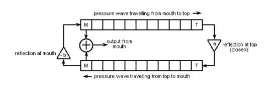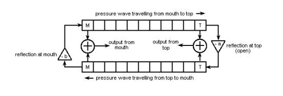 Figure 2. Waveguide synthesis – stopped flue pipe A simple model for a stopped flue pipe is sketched in Figure 2. There are two differences from that for the open pipe case (Figure 1) – firstly no sound is emitted from the top of the pipe so the adder at that point is omitted, and secondly the reflected wave undergoes no phase change when it bounces off the stopper as explained in [3]. Therefore the multiplicand at the top of the pipe is a positive number rather than a negative one. Otherwise the two models work in much the same way. An interesting feature of this model, simple though it might be, is that it will not generate any even-numbered harmonics. This is appropriate for stopped pipes in which the odd harmonics predominate. However the simulated pipe will nevertheless sound artificial when using such a simple model because in practice it is necessary to include the low levels of even harmonics which are present in the sound of a real pipe. A real stopped pipe never suppresses the even harmonics completely. This means the model needs to be considerably more complicated in practice than that shown here. The physics of the organ reed pipe are described in detail elsewhere on this website [4] and, like the flue pipe, it can also be modelled successfully using waveguide methods. There is little room for arguments and excuses here because the clarinet was one of the first instruments to be successfully modelled in detail by workers such as Benade some 40 years ago, and the clarinet is far more complicated than any organ reed pipe. This is because of the many variables characterising the player’s embouchure (the way the reed is controlled via the lips and mouth), the continuously variable blowing pressure and the subtle acoustic mechanism of the tone (finger) holes. Also it operates over a frequency range of several octaves. None of these is present in the organ reed pipe – there is obviously no equivalent of the embouchure, the wind pressure is fixed, there are no tone holes and the pipe emits only a single fundamental frequency. Therefore it is much easier to set up a physical model of an organ reed pipe than a woodwind instrument. There are several major differences between flue and reed pipe models because of the different oscillation mechanisms and the wider range of resonator shapes and sizes in the case of reeds. However physical models of reed pipes will not be discussed further here because the main features of waveguide modelling have already been described above. Factors
