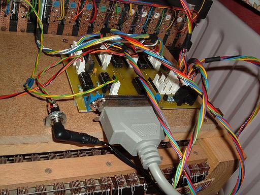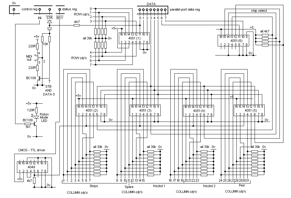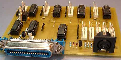 It is worth mentioning an advantage of this type of scanning, which is that all controls on the console are initialised when the system is switched on. Therefore all stops which have been left 'on', the position of the swell pedals, etc will be acknowledged by Prog Organ from the outset of the playing session. This is a convenience to the player, especially as some like to leave certain stops such as 'great to pedal pistons coupled' permanently drawn. It brings the system closer to what the player would expect to happen on most pipe organs. By contrast, most MIDI systems do not do this. In this case all the stops have to be cancelled, the swell pedals exercised, etc before any MIDI signals are sent to the VPO to initialise the state of the console. The use of the parallel port (or any other) for console scanning delivers high performance in terms of a low latency overhead, but it makes Prog Organ and this console scanner non-standard as far as digital musical instruments are concerned. Therefore the software was designed from the outset to also include a conventional MIDI input option. When this is used the console scanner just outlined obviously cannot be employed exactly in the form described. Therefore the scanner hardware itself was also designed to incorporate a MIDI option. Instead of driving the scanner board from the PC, a PIC microcontroller sub-system was developed which emulates a parallel port. This is simply plugged into the Centronics socket on the main scanner board, which therefore continues to think it is being driven from a parallel port. But the PIC also instructs the system to emit MIDI messages from the DIN socket which observant readers might have noticed already in Figure 4. (This socket performs no function when parallel port scanning driven by a PC is used).