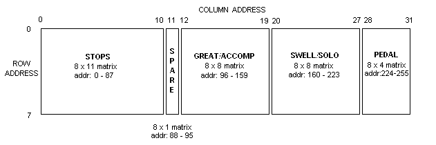 Figure 1 shows how the contacts of a keyboard can be wired into a switch matrix with 8 rows and 8 columns. (With 61 notes this leaves 3 spare, which can be used for any other purpose such as couplers, pistons, tremulants, etc). Each contact must have a series diode for the reason explained presently. In the diagram the key contact at top left corresponds to bottom C. Successive notes then run sequentially down column 0, then down column 1, and so on. In practice it does not matter how they are wired but the arrangement shown is one logical example. Assume the console scanner first puts a logic high level (binary ‘1’ - say 5 volts) onto row 0 of the matrix. Then if bottom C happens to be keyed, a ‘1’ will appear on column 0 only. Likewise, if middle C happens to be keyed as well, a ‘1’ will also arise on column 3. All other columns will remain at ‘0’. Therefore by scanning across all 8 columns while keeping row 0 at ‘1’, the matrix coordinates (row and column addresses) of all depressed keys on row 0 will be obtained in sequence by noting when a ‘1’ appears on a particular column. From these coordinates the computer can then work out which notes are currently keyed. The scanner then returns row 0 to logic ‘0’ (zero volts say) and puts a ‘1’ on row 1 instead, again scanning all the columns to find which keys are pressed. This continues until all the rows and columns have been scanned. This method of scanning a keyboard is used purely for economy of wiring. Instead of requiring 61 wires from each keyboard going into the scanner, only 16 are needed (8 rows plus 8 columns). This is a considerable simplification. But note that it does not reduce the time required to scan the keyboard because the 61 contacts still have to be scanned individually. In fact, because 64 contacts are actually scanned in this example, using matrixed rather than direct addressing will slightly increase the scan time for this keyboard. The diodes are necessary to prevent ‘phantom’ switch closures. Consider what would happen if bottom C (row 0/column 0) and bottom G (row 7/column 0) were pressed simultaneously without diodes being used. When the scanner activates row 0 with a ‘1’, row 7 will also be activated via current flowing in the reverse direction through the bottom G key contact. Thus notes keyed on row 7 would also be detected while the scanner was deluded into thinking it was only scanning row 0. This would cause mayhem in a system without diodes to prevent it, with the result that many unwanted notes would sound as the system scanned the contact array. The matrix idea can be extended to encompass an entire console. Figure 2 shows one of many possible scanner address maps for a console with two manuals and pedals. Up to 88 stops plus some spare (unused) contacts are also mapped into the matrix. As before, there are 8 rows in the matrix but this time 32 columns. Each manual keyboard occupies a block of 8 x 8 contacts as per Figure 1, the pedals a block of 8 x 4 and the stops a block of 8 x 11. There are 256 contacts in total in this console including the spares.