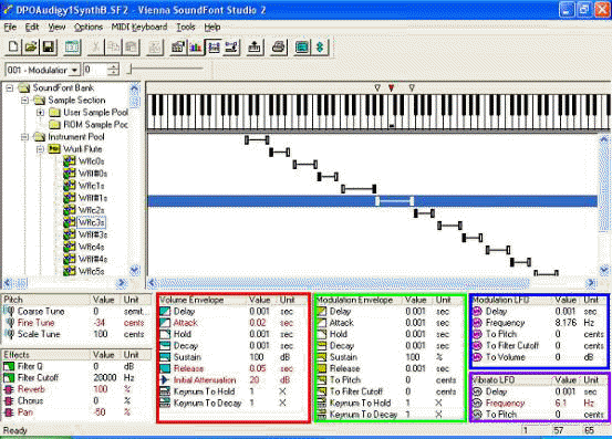 A picture of a typical computer display for the type of digital synthesiser under discussion is shown in Figure 8.  This is in fact a screenshot of the SoundFont editing program ‘Vienna’ (version 2.3), and it was chosen because SoundFonts are probably the most standardised and widely available synthesiser format in general use today.  Choosing a standard and well known format was done simply to facilitate the discussions in this article rather than necessarily implying any recommendation for their use, and for the same reason the note generator schematic depicted in Figure 7 also broadly corresponds to this standard.