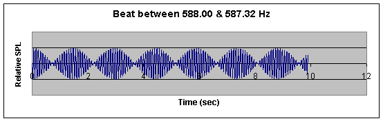 You can see immediately that there is a slow modulation of the strength of the sound, which rises to a maximum before falling momentarily to zero.  This cycle is repeated, leading to the phenomenon of what we call beats.  The beat frequency equals the difference between the two frequencies  f1 and  f2 , so in this case the beat frequency is 0.68 Hz.  Hertz is another name for cycles per second so the reciprocal of this figure, 1.47 seconds per cycle, shows that each beat cycle takes place over 1.47 seconds which is a little under 1 ½ seconds.  This is a very slow beat, characteristic of the beat rates of the slightly impure intervals used in temperament work.  The pitch of the note heard is that of treble D (an octave plus a tone above middle C).