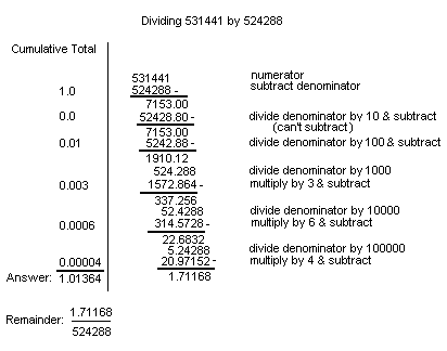 The example below shows how the two numbers 531441 (the numerator) and 524288 (the denominator) can be divided using the age-old method of long division to give the answer 1.01364.  This is the minimum precision, 6 significant digits, required to represent numbers when doing temperament arithmetic (Appendix 2).  Desirably it would be better to work to at least one further digit so that the 6 digit answer could be rounded rather than truncated.  No problem with an electronic calculator, though I am sure you will agree that the enthusiasm to do this by hand would rapidly wane.